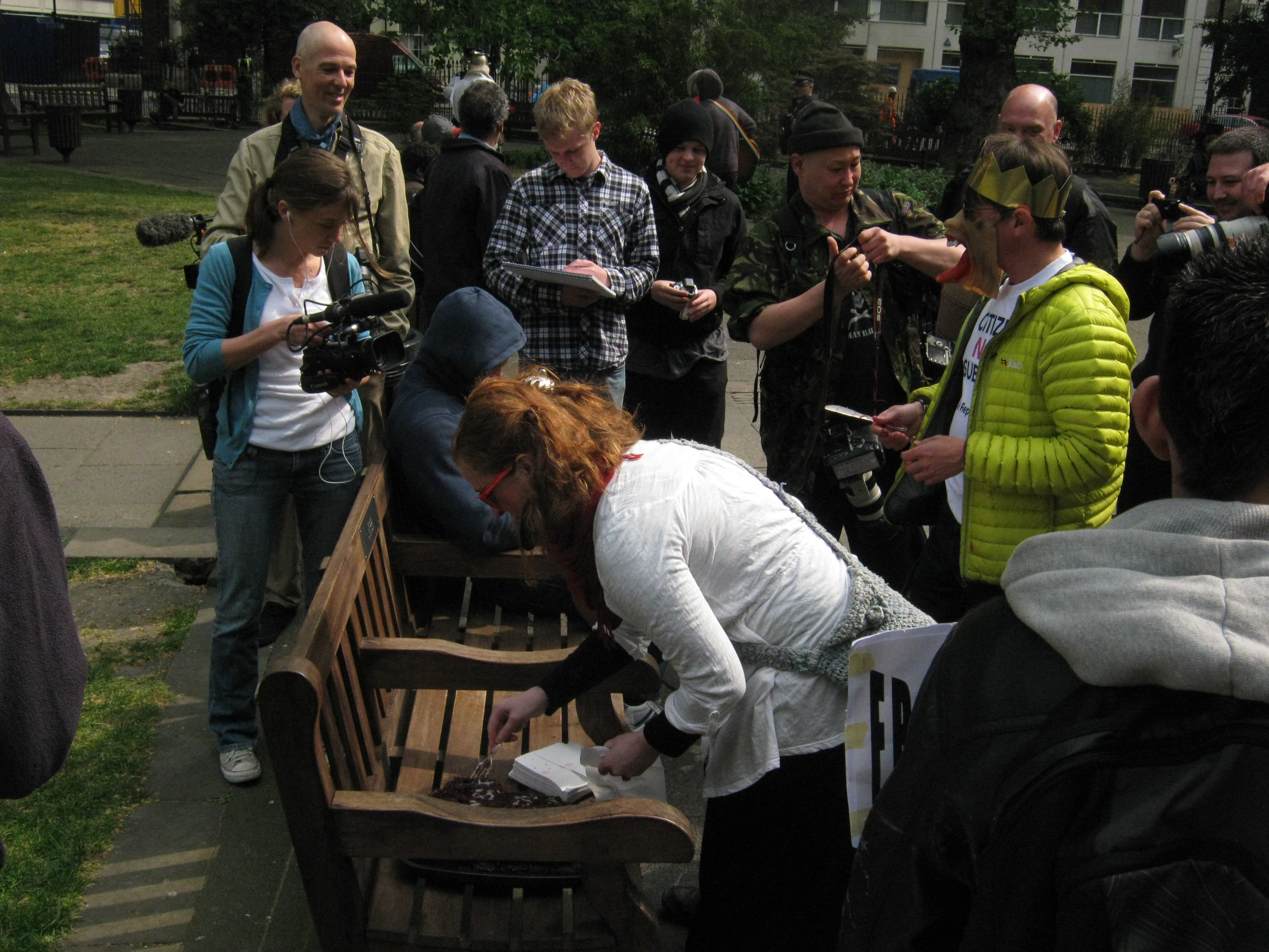 • After maybe twenty minutes the people who I’m lazily referring to as anarchists (probably republican but other than that I have no idea what their aims/objectives/sympathies were) cut a ‘zombie wedding cake’ – I finally came in closer to get a picture. Eventually I stood on a bench to get a decent shot past all the other press, but I noticed that many cameras were trained on me, not the cake, as they were there to report on zombies and I was the only one who looked like a sodding zombie.