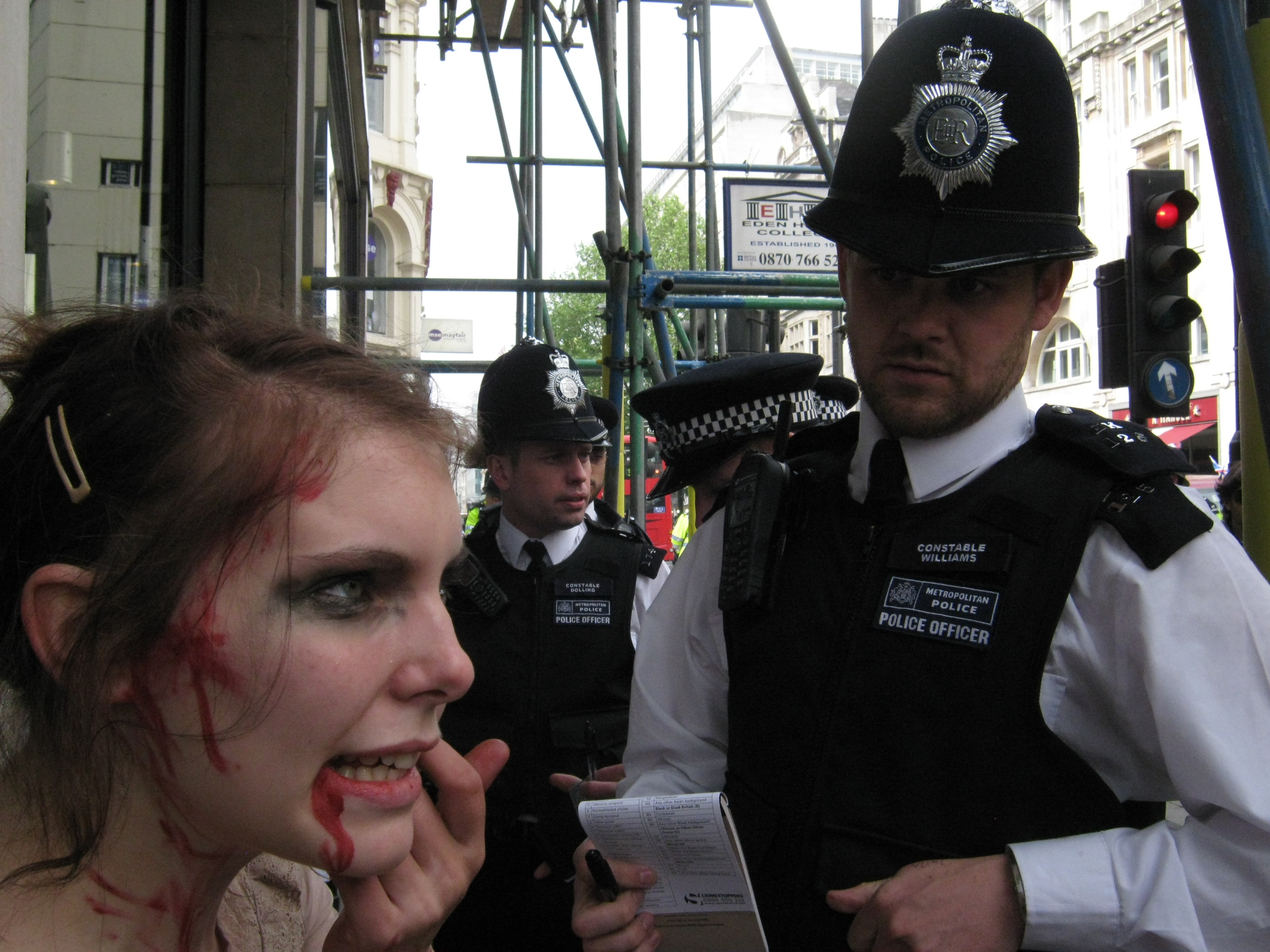 I said if dressing like a zombie was a breach of the peace then I breached the peace every hallowe’en. The police in question clearly knew it was a bit ridiculous, and made quite pleasant chit-chat throughout. Constable Loughlin (EK477) who was searching Erich, upon hearing his accent asked “you over here on holiday? You enjoying it? Shame today’s a bit cloudy, isn’t it?” The officer searching Amy made chit-chat about the book in her bag (A Million Little Pieces) “Have you read that book?”