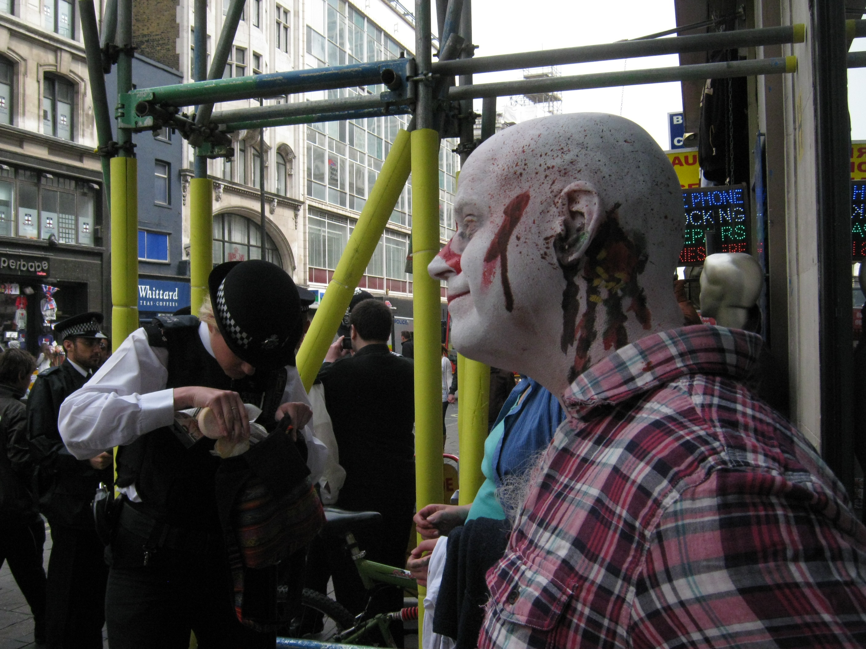 As this was happening I spotted that three of the four roads leading off Soho Square were now lined with police, with police vans parked nearby. I went back to where our fellow-zombies were painting faces and said we should move now. We went out the one unblocked road, back on to Oxford Street. Amy Cutler joked that at this point the zombie demonstration had “split into demonstrators and zombies.”