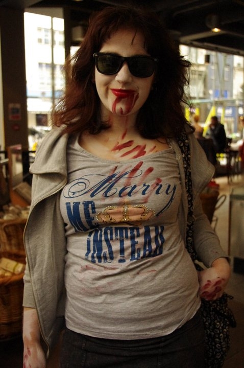 My friend Chris Farnell runs a zombie blog, and had heard there would be an event involving zombies for the Royal Wedding. As Chris lives in Norwich and I live in London, he asked if I would go along to take pictures and report for him. I had heard that Queer Resistance were some of the organizers and that there would be a gay zombie wedding as part of the celebration. I wasn’t sure on any of the finer details, but it sounded like fun.