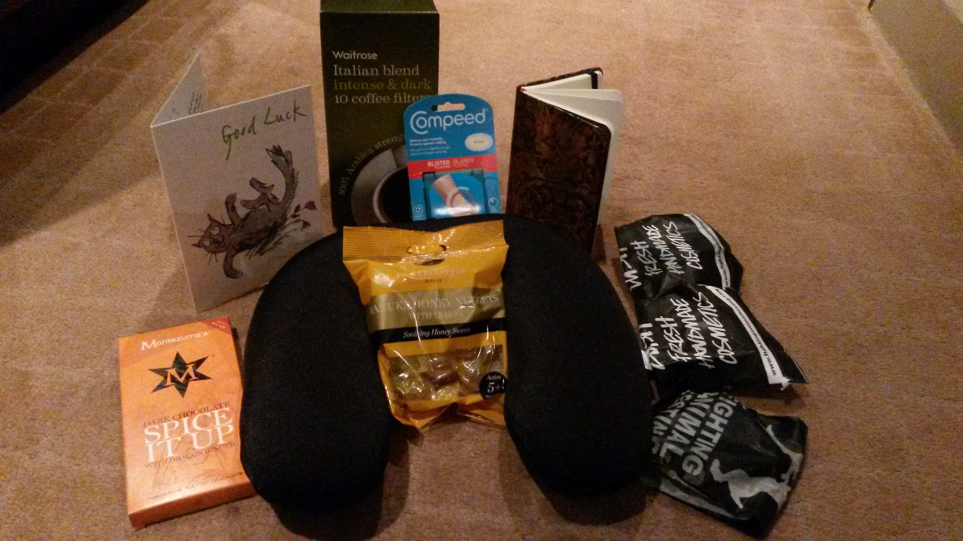 The picture is of an Edinburgh care package some of my amazing friends put together for me just before I left. I’ve had messages of support from friends from all over – from people I hadn’t heard from in months to people I never expected to be interested in poetry to… it’s just been lovely. I’ve been bowled over. <3!