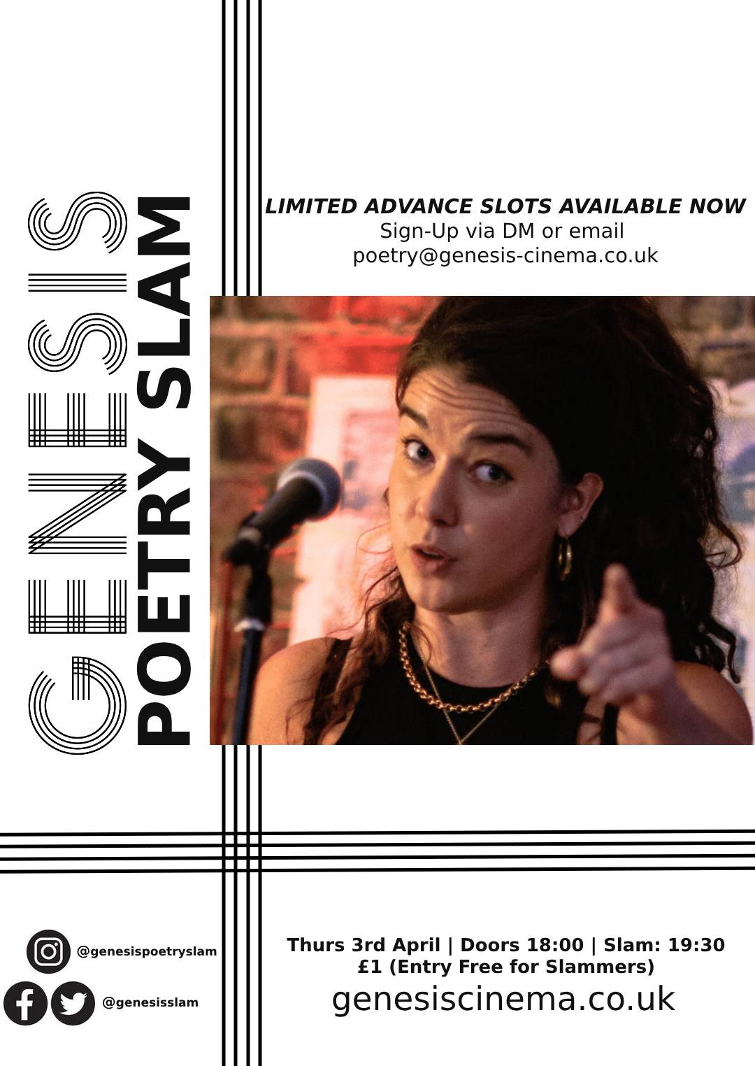 Hannah Chutzpah is part of the team that runs and hosts the Genesis Poetry Slam – London’s only three-round slam. It takes place on the first Thursday of the month, at Genesis Cinema, Whitechapel.